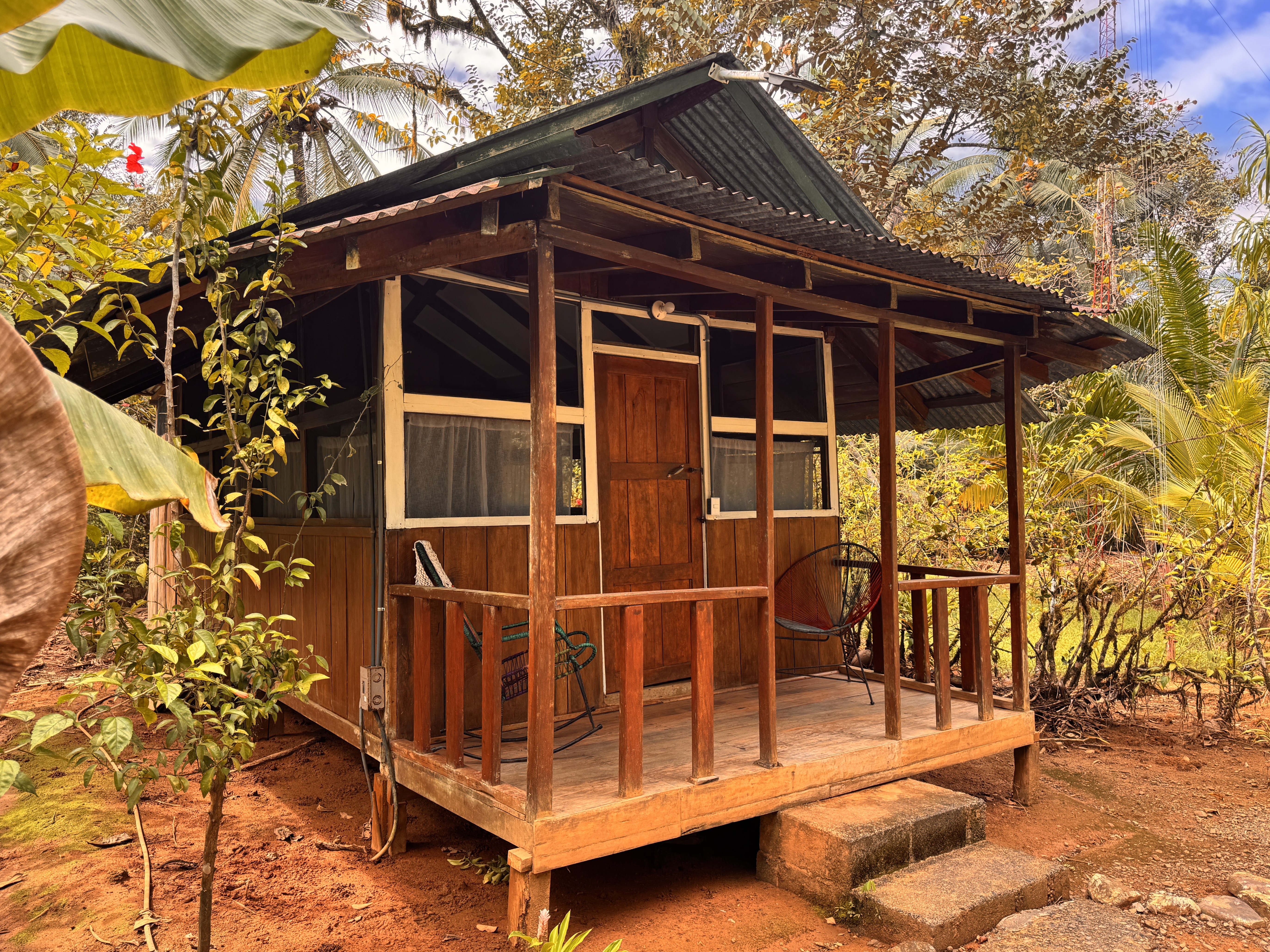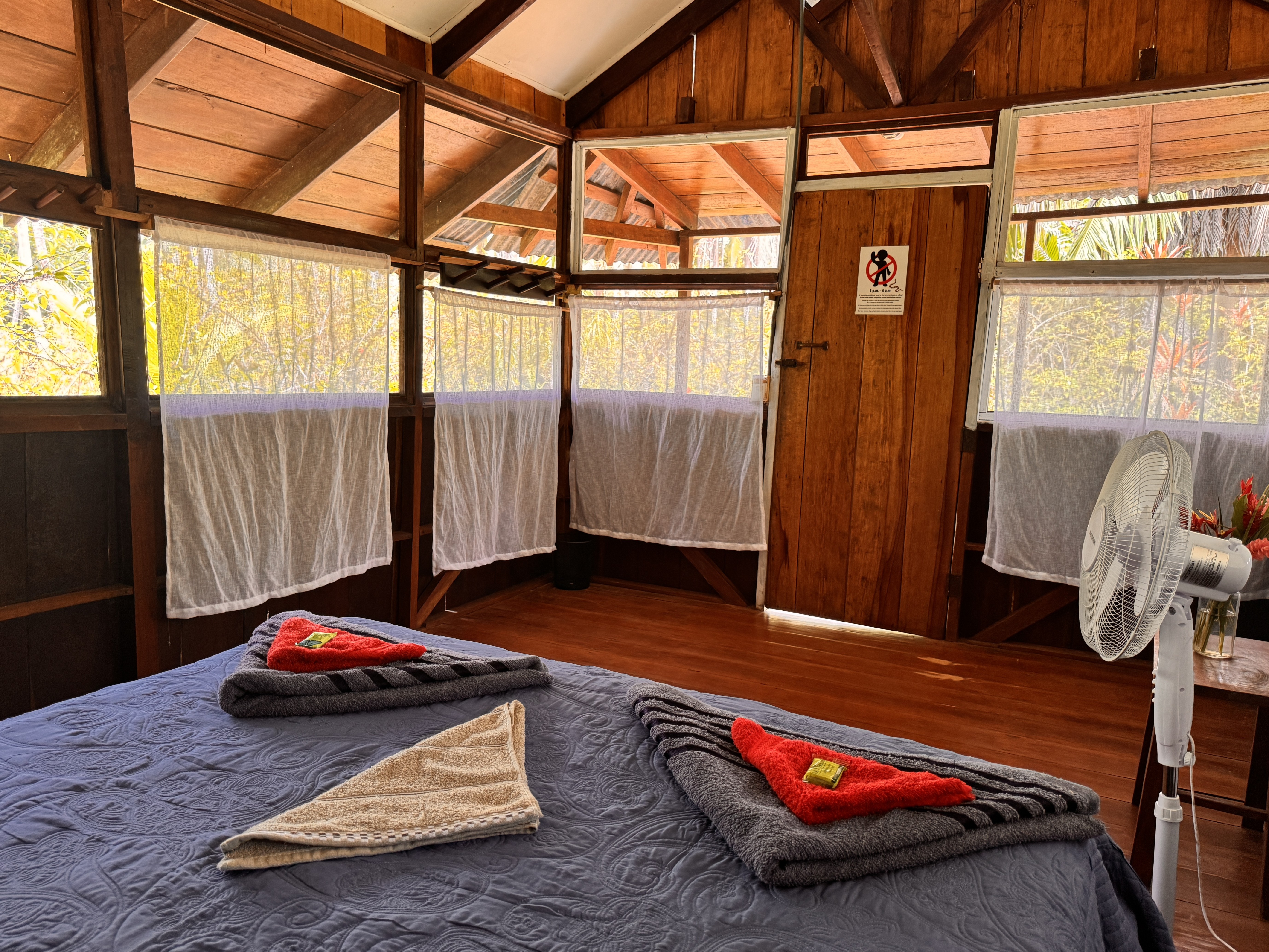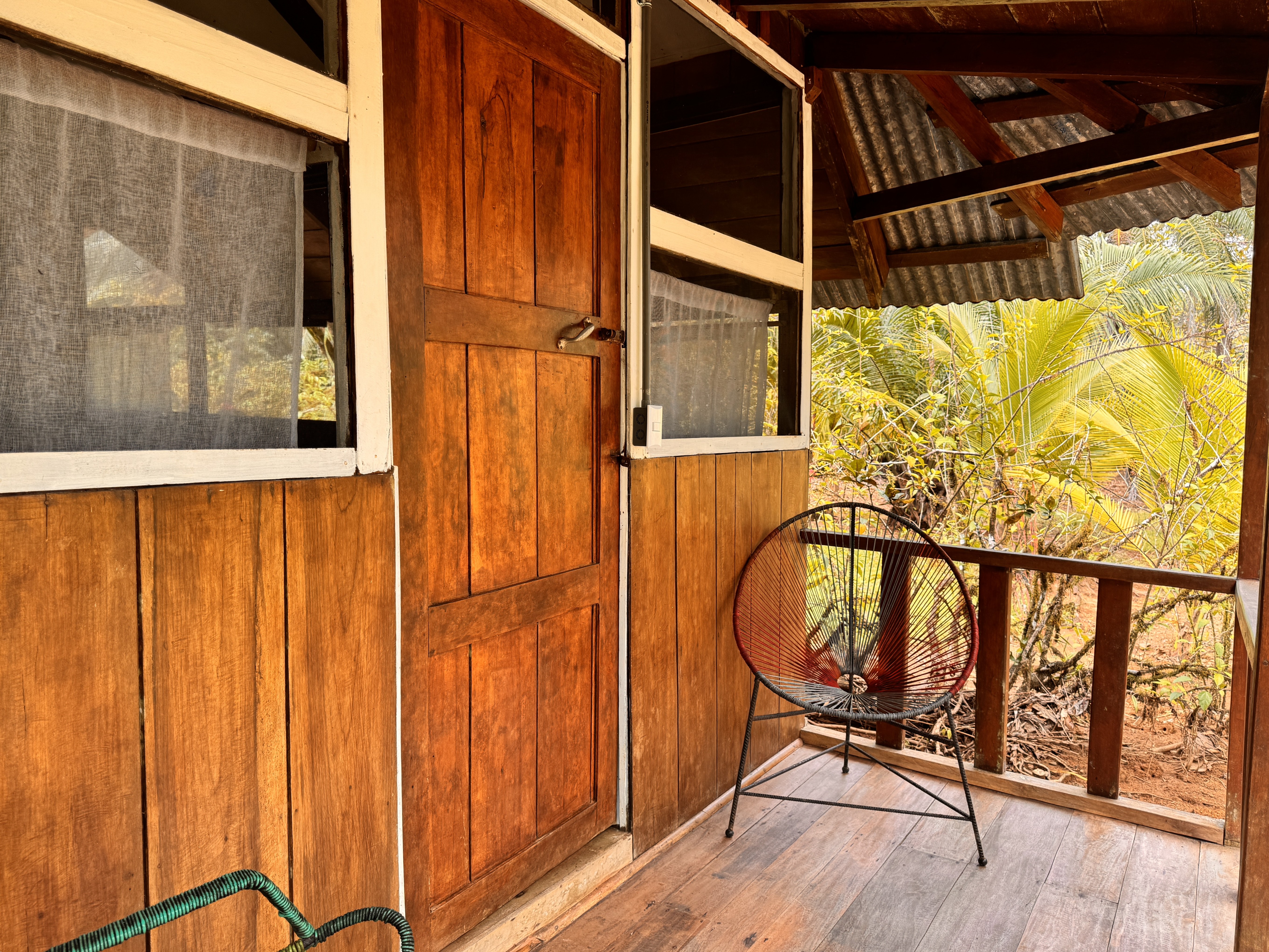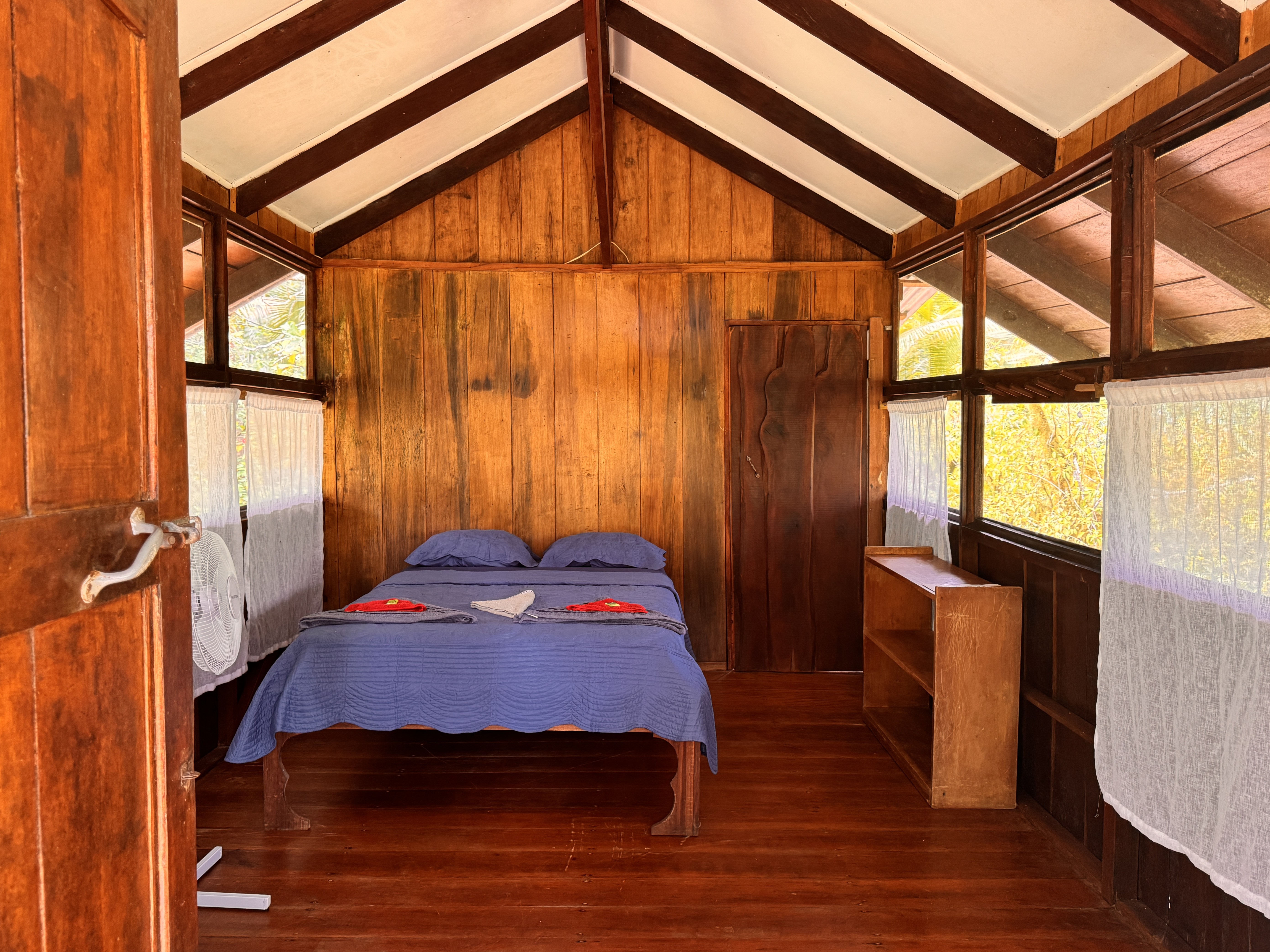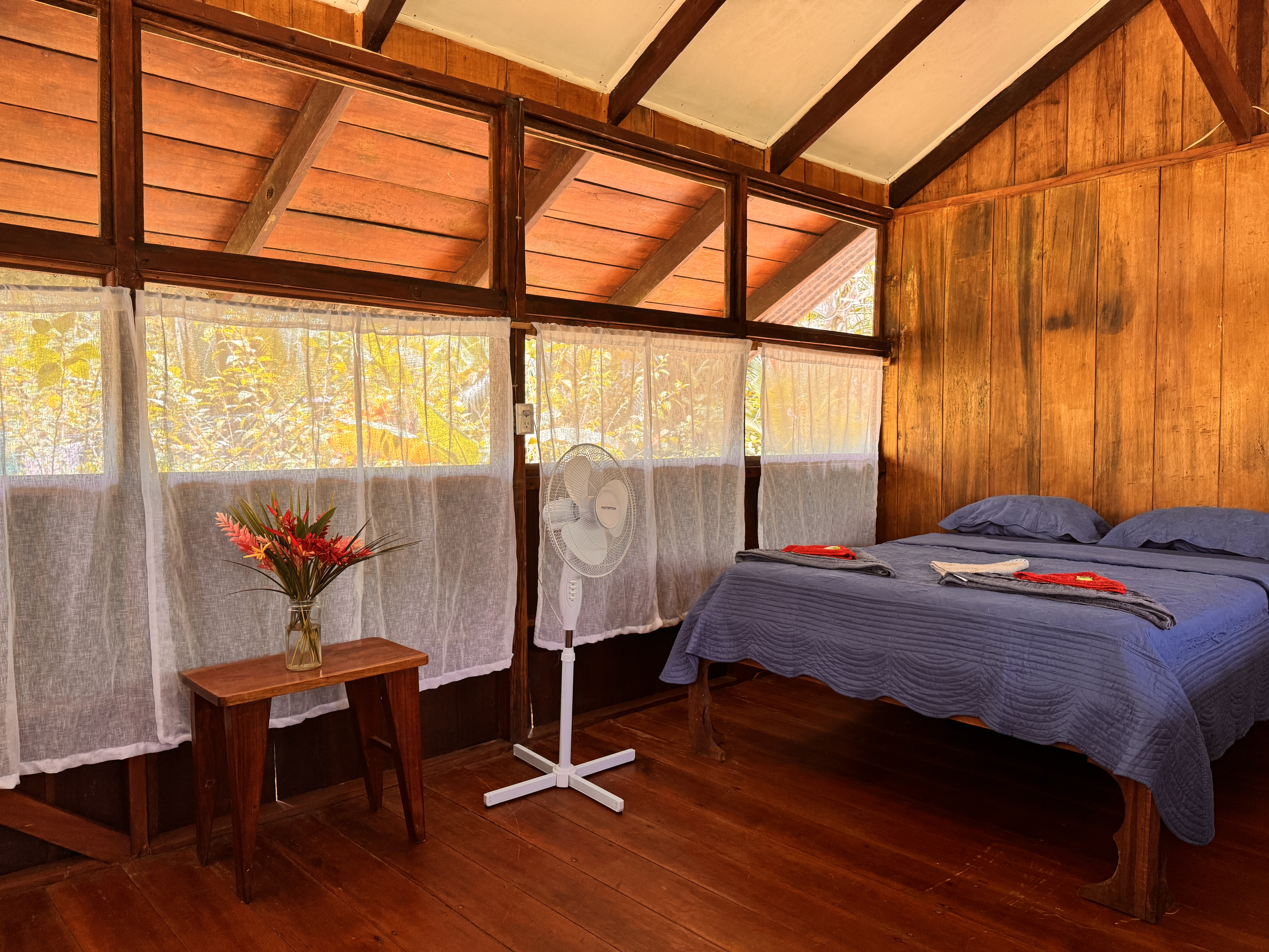 Casa Mono is the perfect choice for guests seeking tranquility and the rustic charm of Costa Rica’s countryside from days gone by. Located along the path leading to our private dock, it sits in a peaceful area with no other cabins nearby, offering privacy and a calm atmosphere surrounded by nature. Like all cabins at Sabalo Lodge, it is elevated on stilts, protecting it from ground moisture and wildlife while allowing natural airflow beneath the structure. Inside, the cabin welcomes up to two guests in a cozy space furnished with a comfortable double bed. The private bathroom includes a shower with hot water, toilet, and sink. A pleasant terrace in front of the cabin provides a relaxing spot to enjoy the sounds of the rainforest. WiFi is available within reach of the cabin. Guests are also invited to enjoy our on-site restaurant with a varied menu, the evening bar serving chilled drinks, and the natural swimming area set in tropical surroundings. Non-alcoholic beverages are available 24 hours a day in self-service mode.