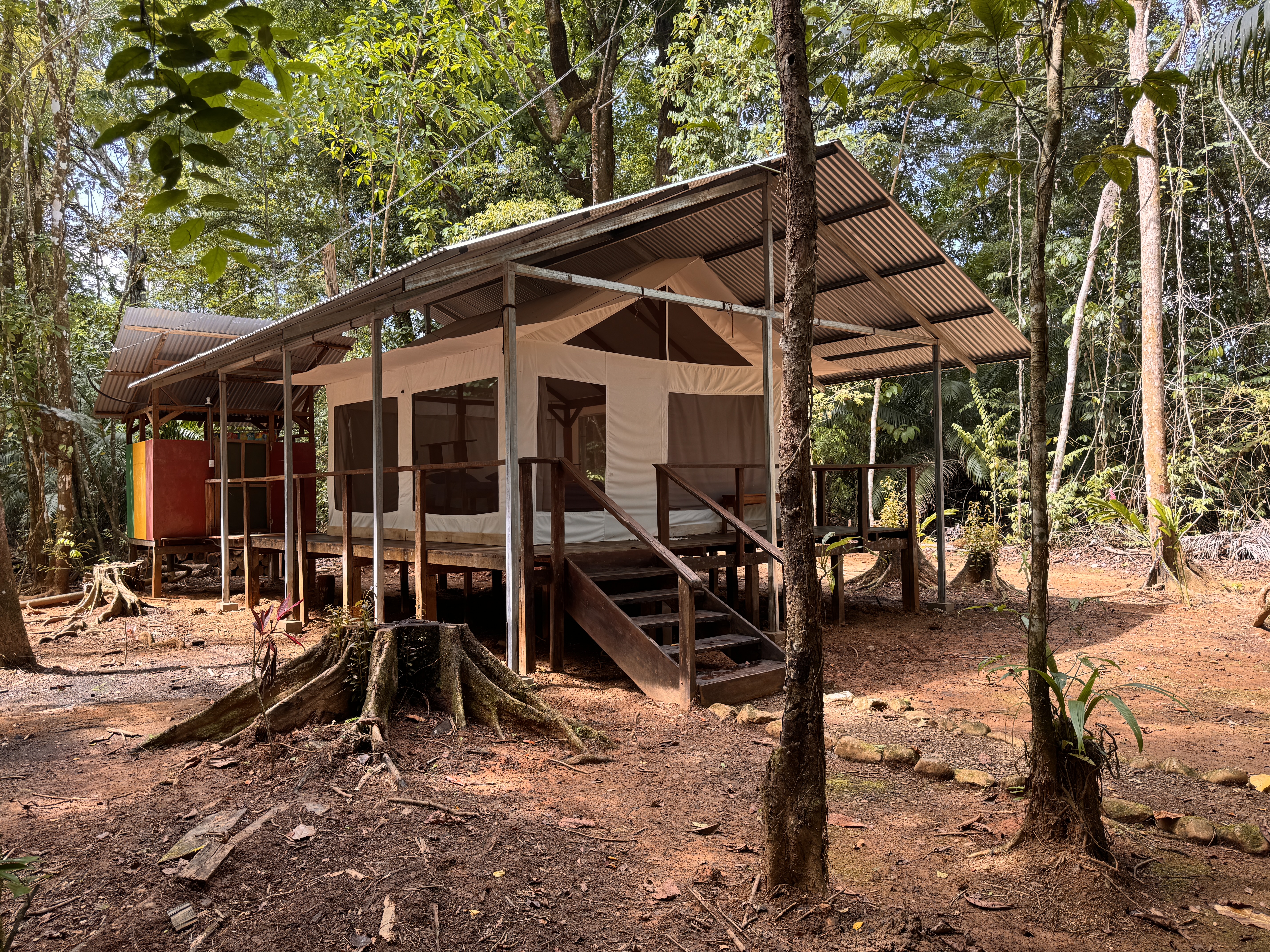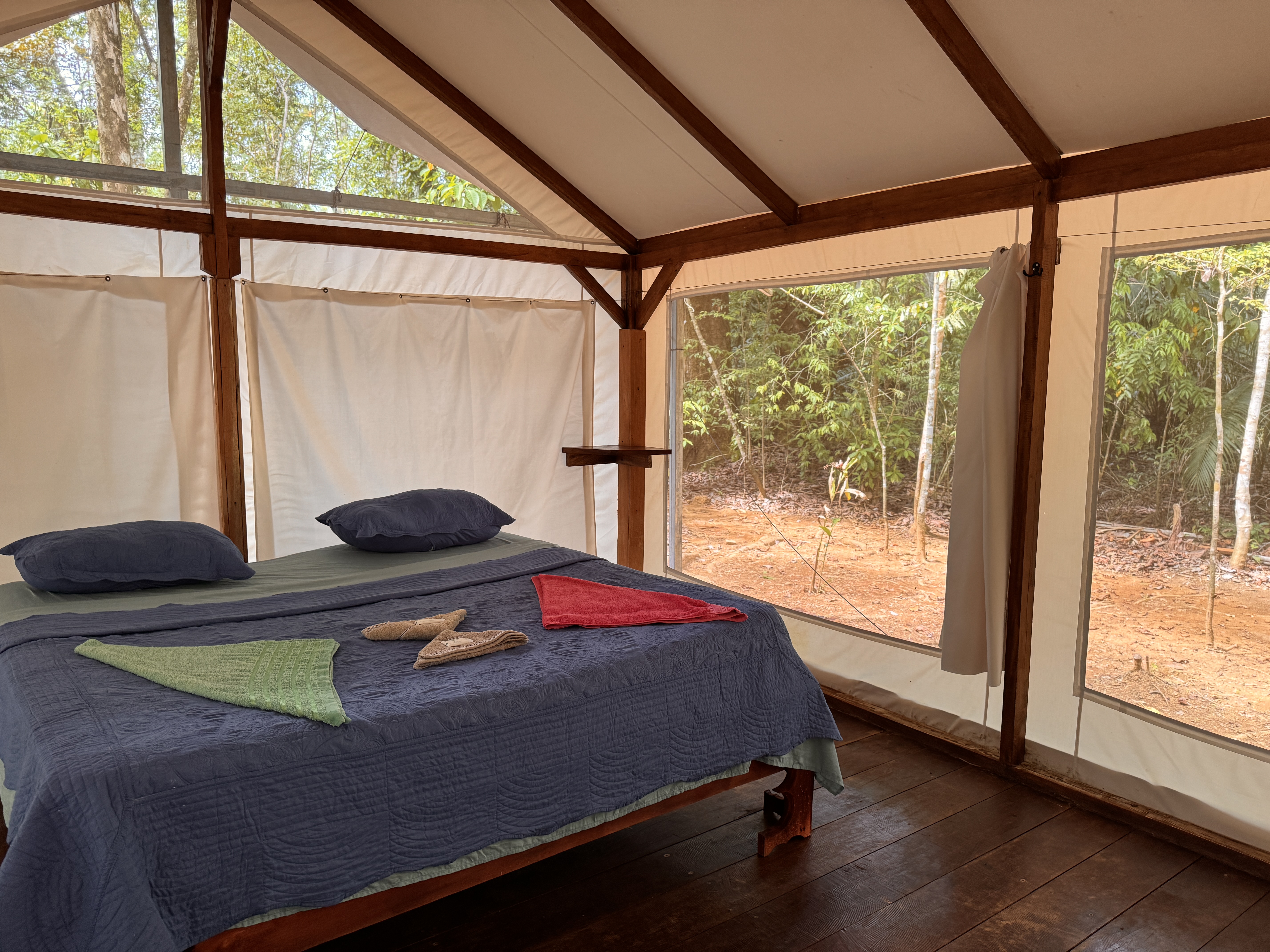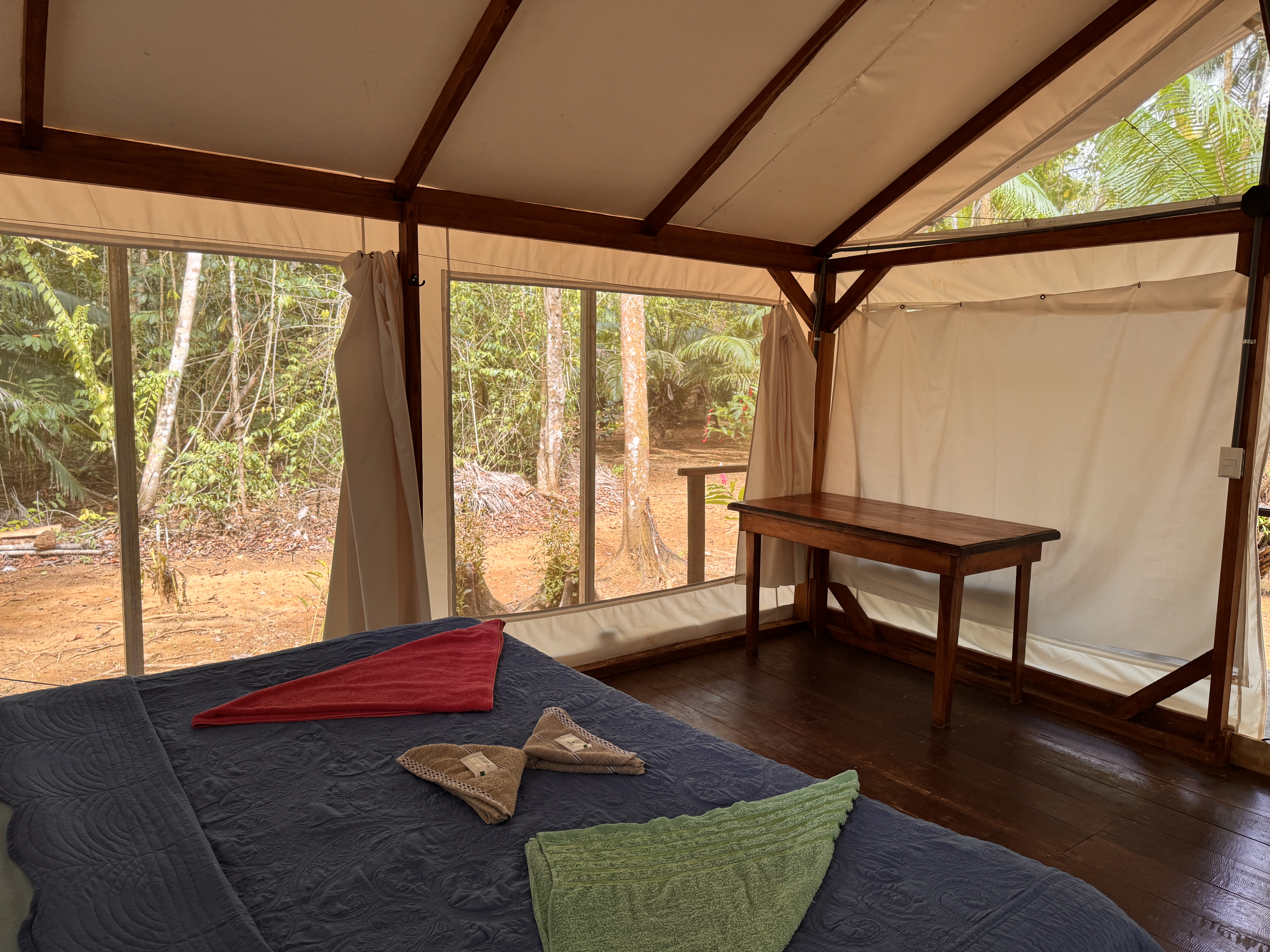 El Bosque is the perfect choice for guests who want to feel truly immersed in the rainforest. Located across the creek in the deeper jungle area of the property, it offers an authentic connection to nature. Here, the sounds of the jungle become part of your stay — monkeys and parrots often serve as your natural morning alarm. When the windows are open, you can look directly into the surrounding greenery through fine protective screens, bringing the jungle right to your bedside. The tent stands elevated on stilts, with a wooden wraparound deck at floor level surrounding the entire structure. From this covered deck, you access your private bathroom located in a separate rear unit. The bathroom includes a toilet, sink, and shower. In autumn, all tents were upgraded with an elevated metal roof installed approximately one meter above the original canvas roof. This double-roof system significantly improves airflow and keeps the interior pleasantly cooler, while the entire deck and front terrace remain protected from rain and sun. The tent is equipped with 110V electricity and a ceiling fan. A portable air-conditioning unit can be rented upon request and works effectively when windows are closed. Even in this deep jungle setting, WiFi is available within reach of the tent. Guests can enjoy our on-site restaurant serving meals throughout the day, relax at the evening bar with chilled drinks, and unwind in the natural swimming area surrounded by tropical greenery. Non-alcoholic beverages are available 24 hours a day in self-service mode.