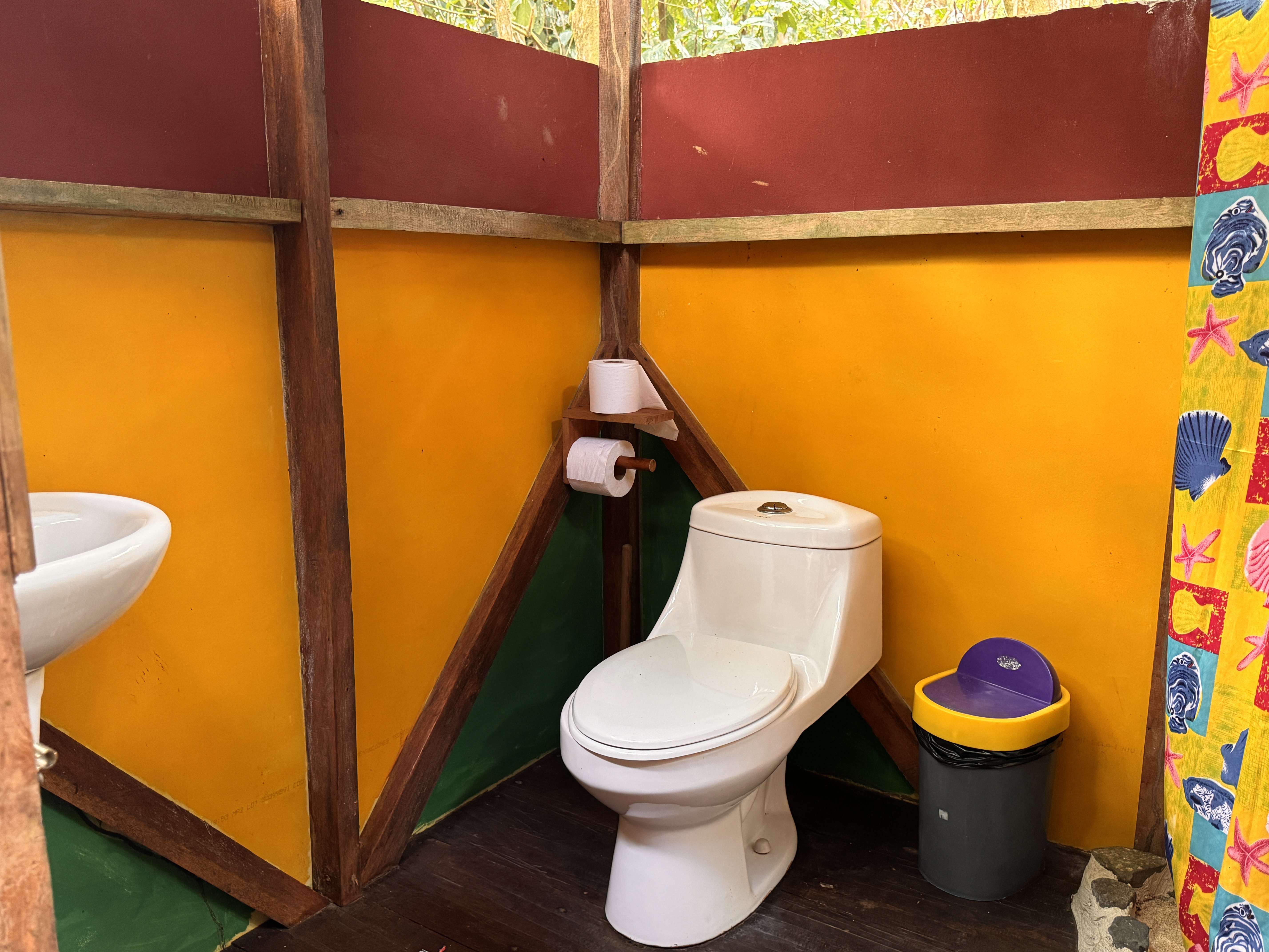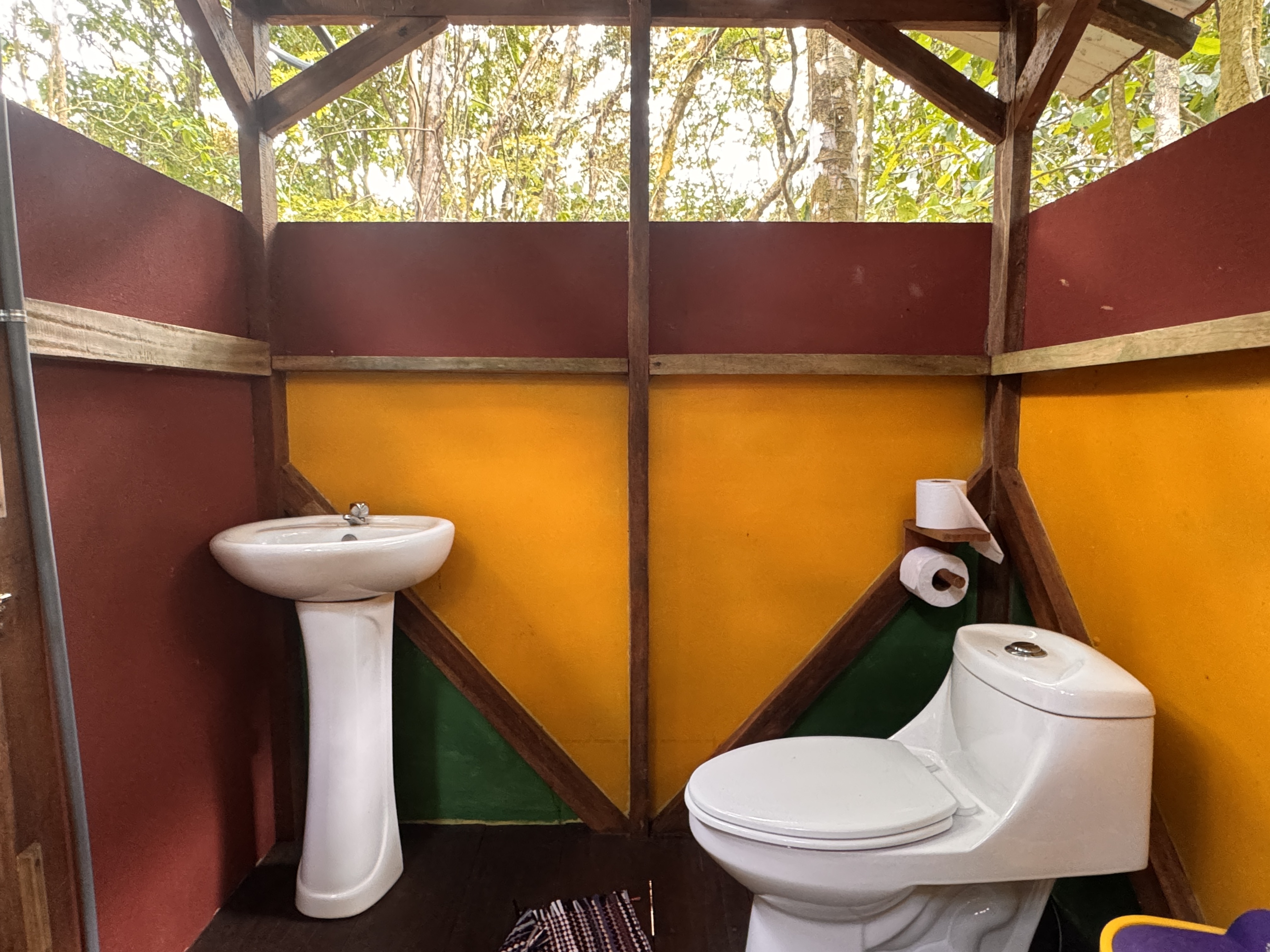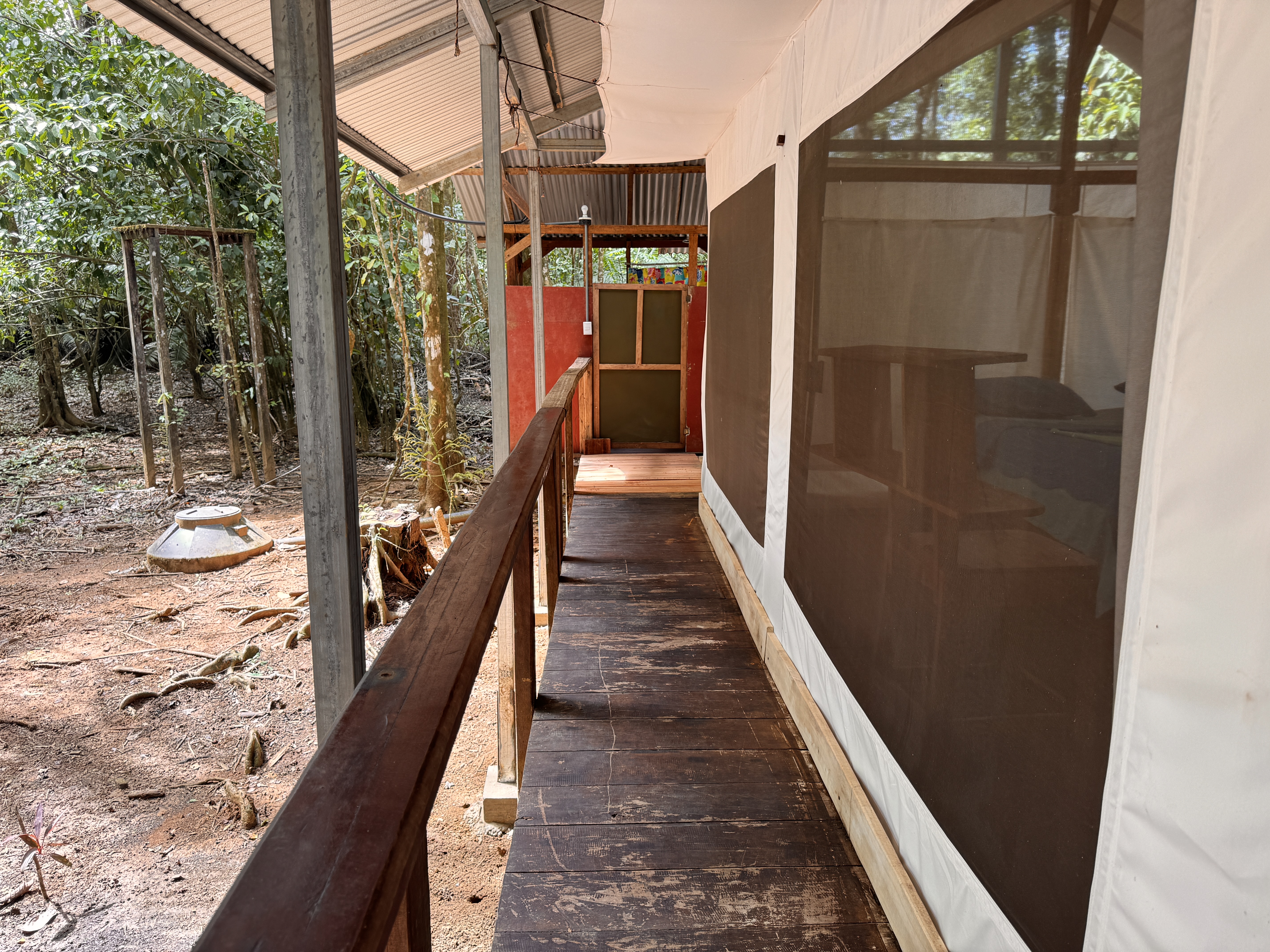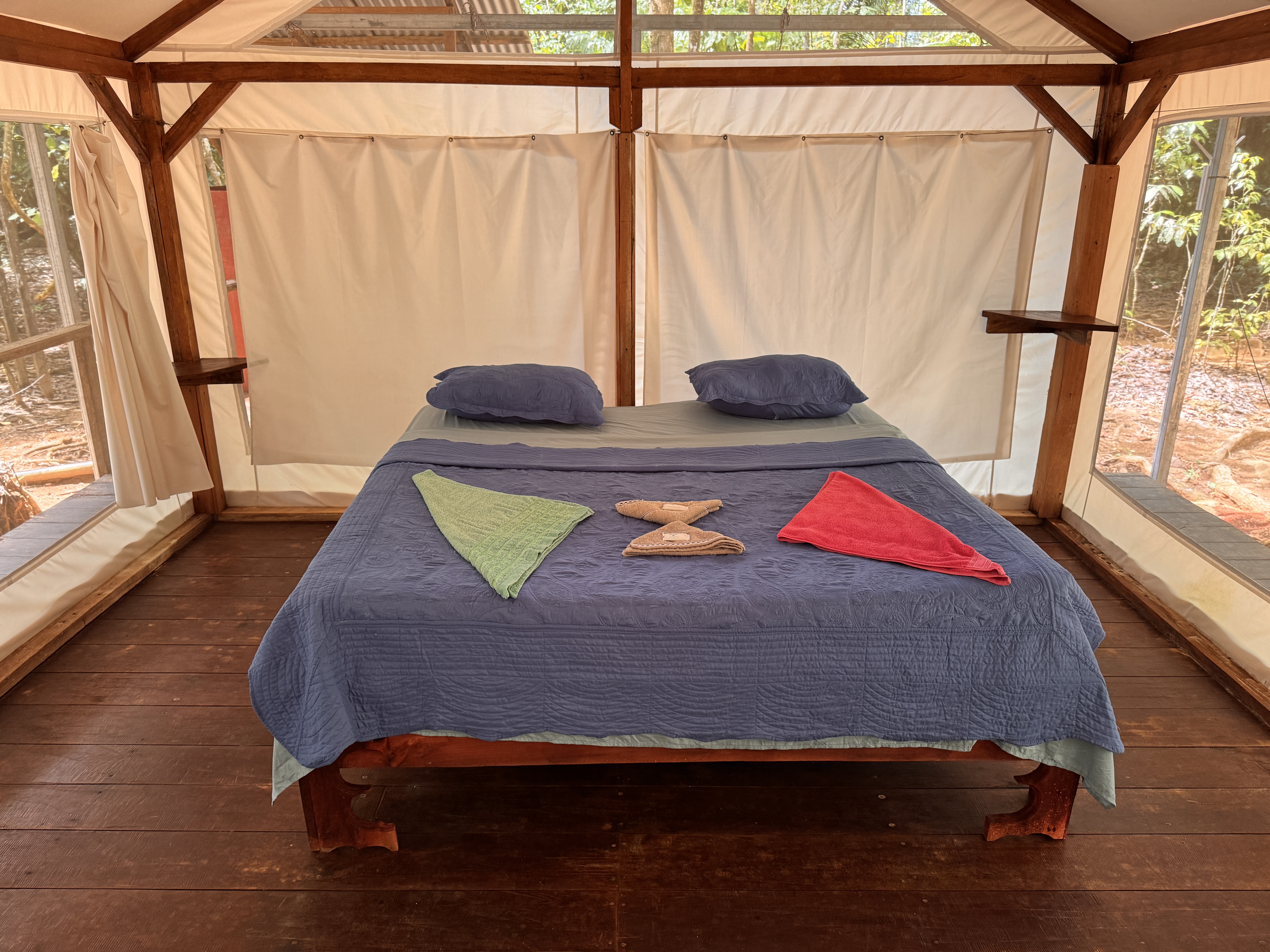 El Bosque is the perfect choice for guests who want to feel truly immersed in the rainforest. Located across the creek in the deeper jungle area of the property, it offers an authentic connection to nature. Here, the sounds of the jungle become part of your stay — monkeys and parrots often serve as your natural morning alarm. When the windows are open, you can look directly into the surrounding greenery through fine protective screens, bringing the jungle right to your bedside. The tent stands elevated on stilts, with a wooden wraparound deck at floor level surrounding the entire structure. From this covered deck, you access your private bathroom located in a separate rear unit. The bathroom includes a toilet, sink, and shower. In autumn, all tents were upgraded with an elevated metal roof installed approximately one meter above the original canvas roof. This double-roof system significantly improves airflow and keeps the interior pleasantly cooler, while the entire deck and front terrace remain protected from rain and sun. The tent is equipped with 110V electricity and a ceiling fan. A portable air-conditioning unit can be rented upon request and works effectively when windows are closed. Even in this deep jungle setting, WiFi is available within reach of the tent. Guests can enjoy our on-site restaurant serving meals throughout the day, relax at the evening bar with chilled drinks, and unwind in the natural swimming area surrounded by tropical greenery. Non-alcoholic beverages are available 24 hours a day in self-service mode.